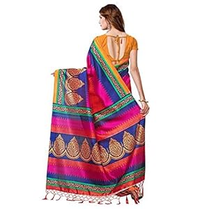 This beautiful multi-coloured art silk saree comes with a large blue and green border with printed floral motif in yellow. The skirt is made of pink, orange and yellow bands. The pallu of the saree has elaborate floral motifs similar to that of the border printed on varying bands of colour. The end is tasselled for a beautiful finished look.